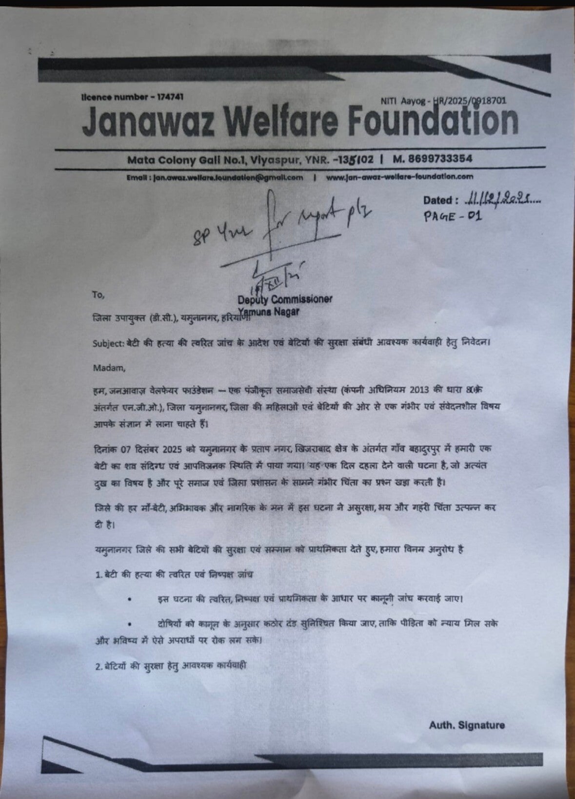 आज जनआवाज़ वेलफ़ेयर फ़ाउंडेशन की टीम बेटियों की आवाज़ बनकर जिला DC और SP से मिली।